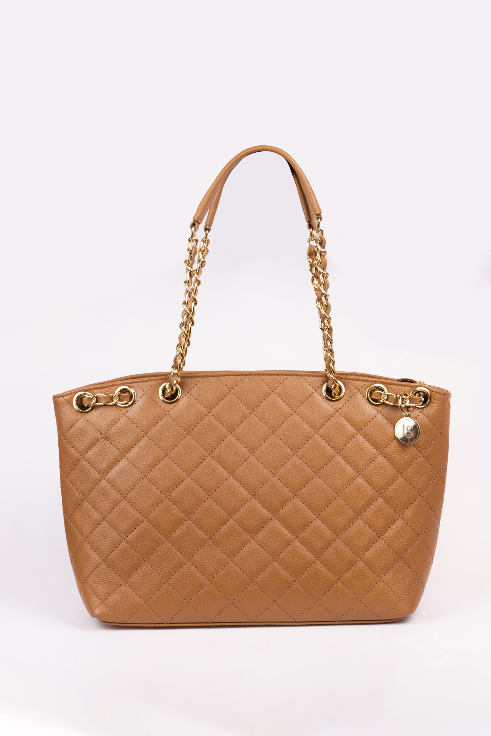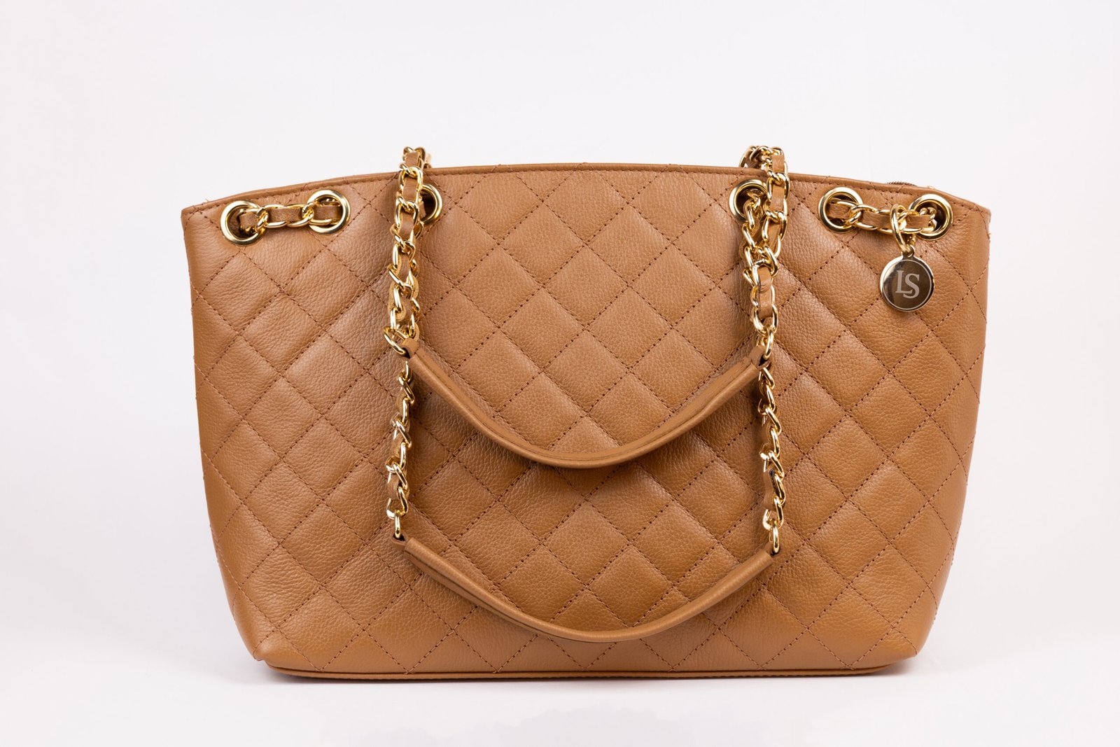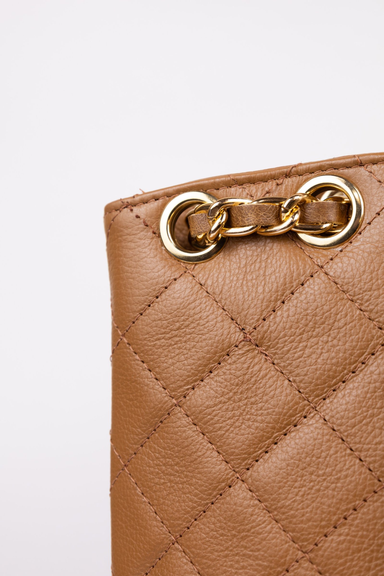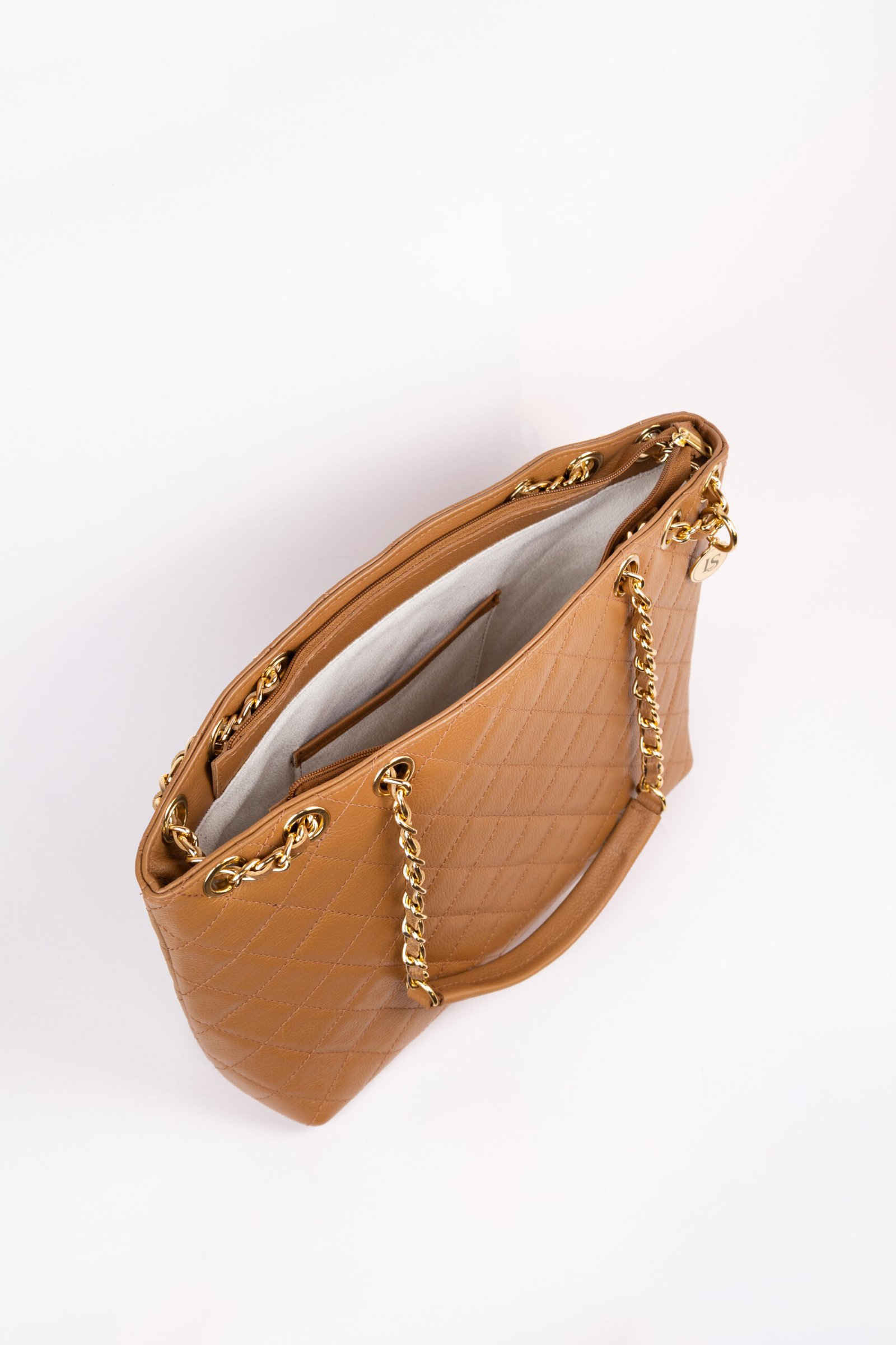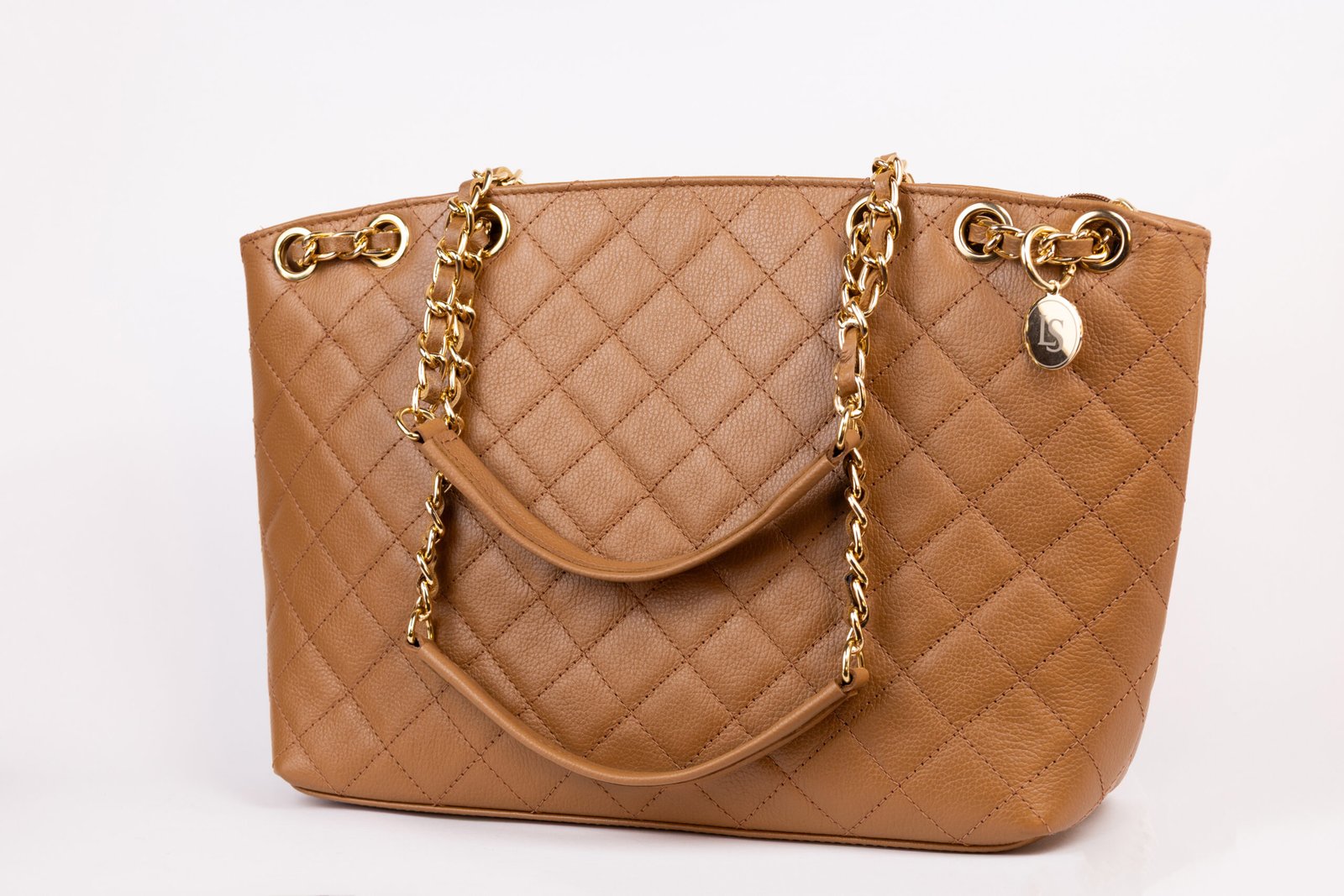 O couro no tom Castor ganha uma nova dimensão com o trabalho acolchoado, criando um relevo que transmite conforto e exclusividade ao toque. A alça de ombro em corrente dourada é o grande diferencial, conferindo um movimento elegante e um brilho solar que ilumina qualquer composição, transitando com perfeição do ambiente de trabalho para eventos sociais.
