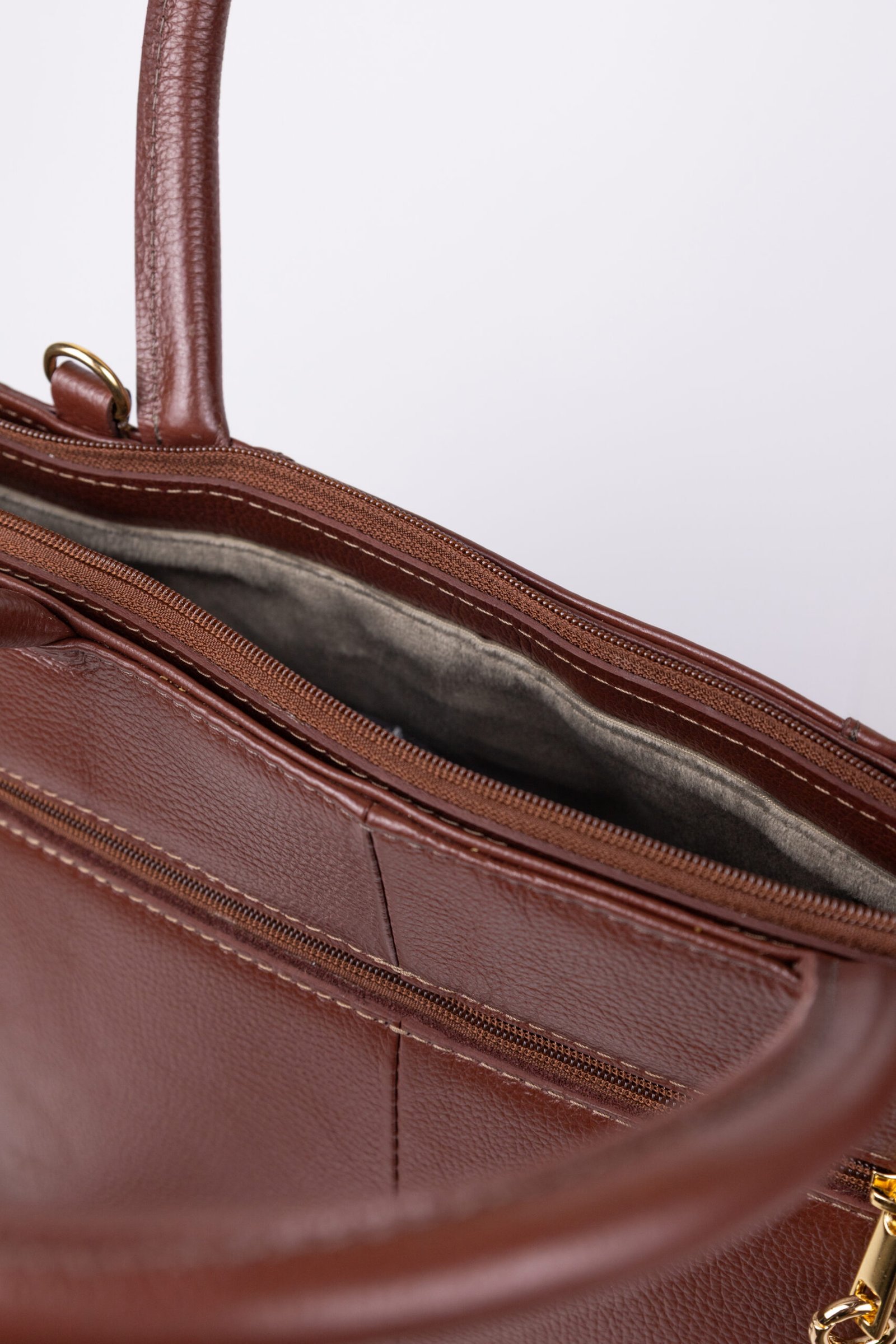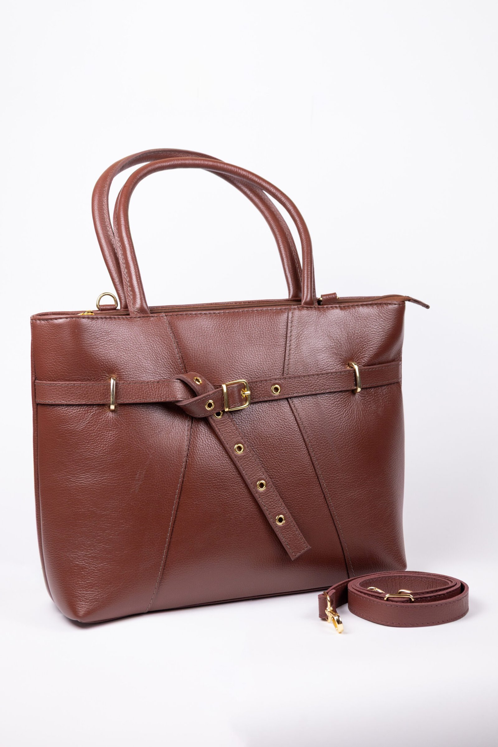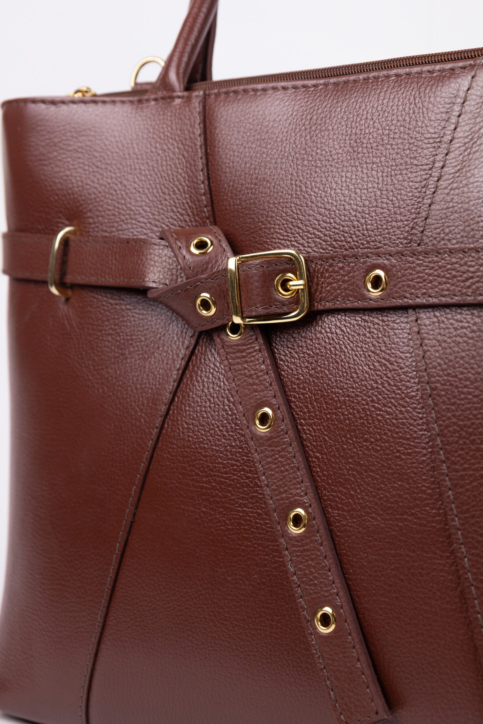 A Bolsa Lyora da Linha Essencial na cor Castanho é o equilíbrio perfeito entre a força e a feminilidade. Com um shape estruturado e linhas limpas, ela se destaca pelo seu sofisticado detalhe frontal: um cinto em couro com ilhoses e fivela dourada que envolve a peça, conferindo um toque de exclusividade e refinamento que atrai todos os olhares.