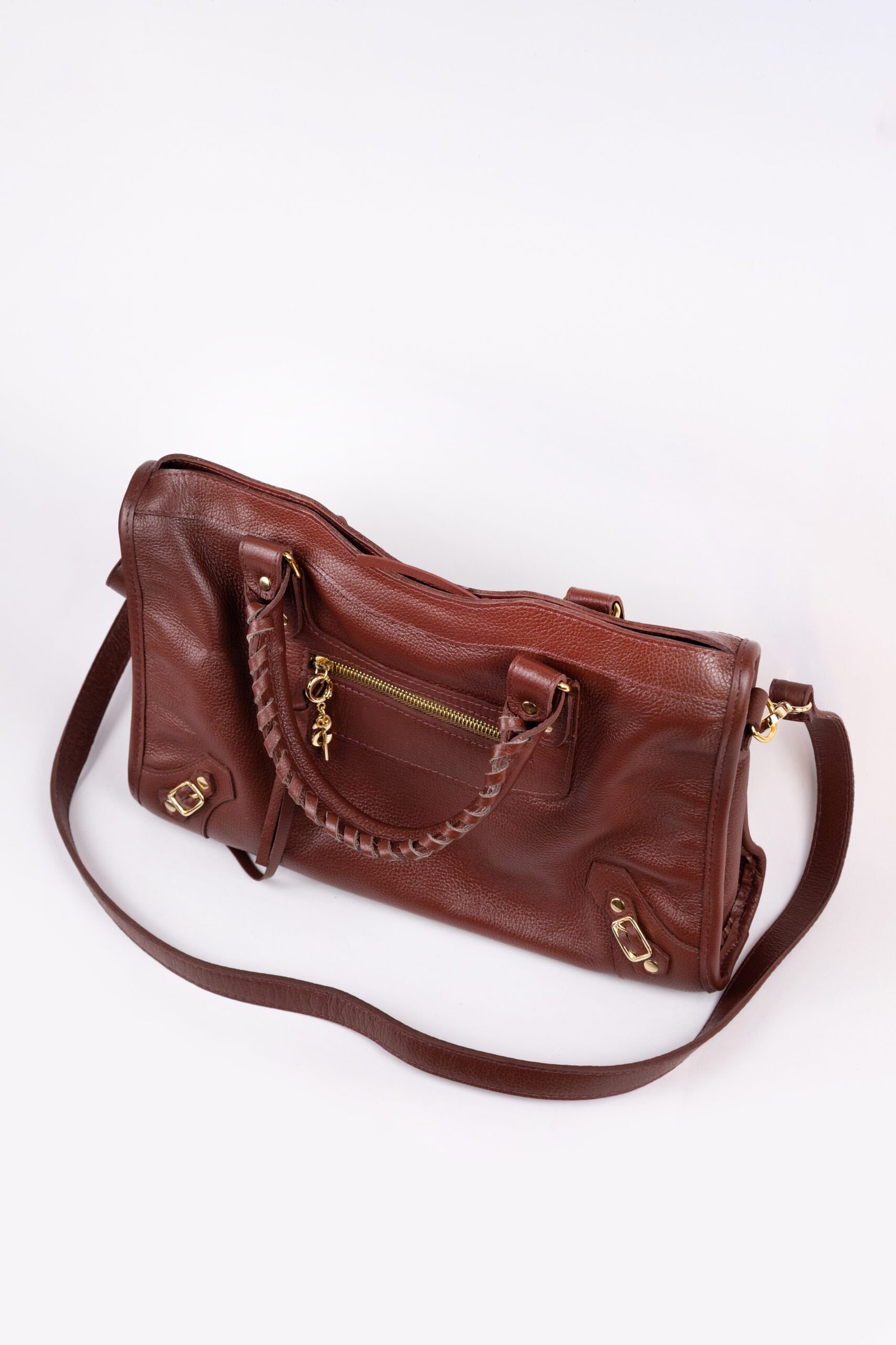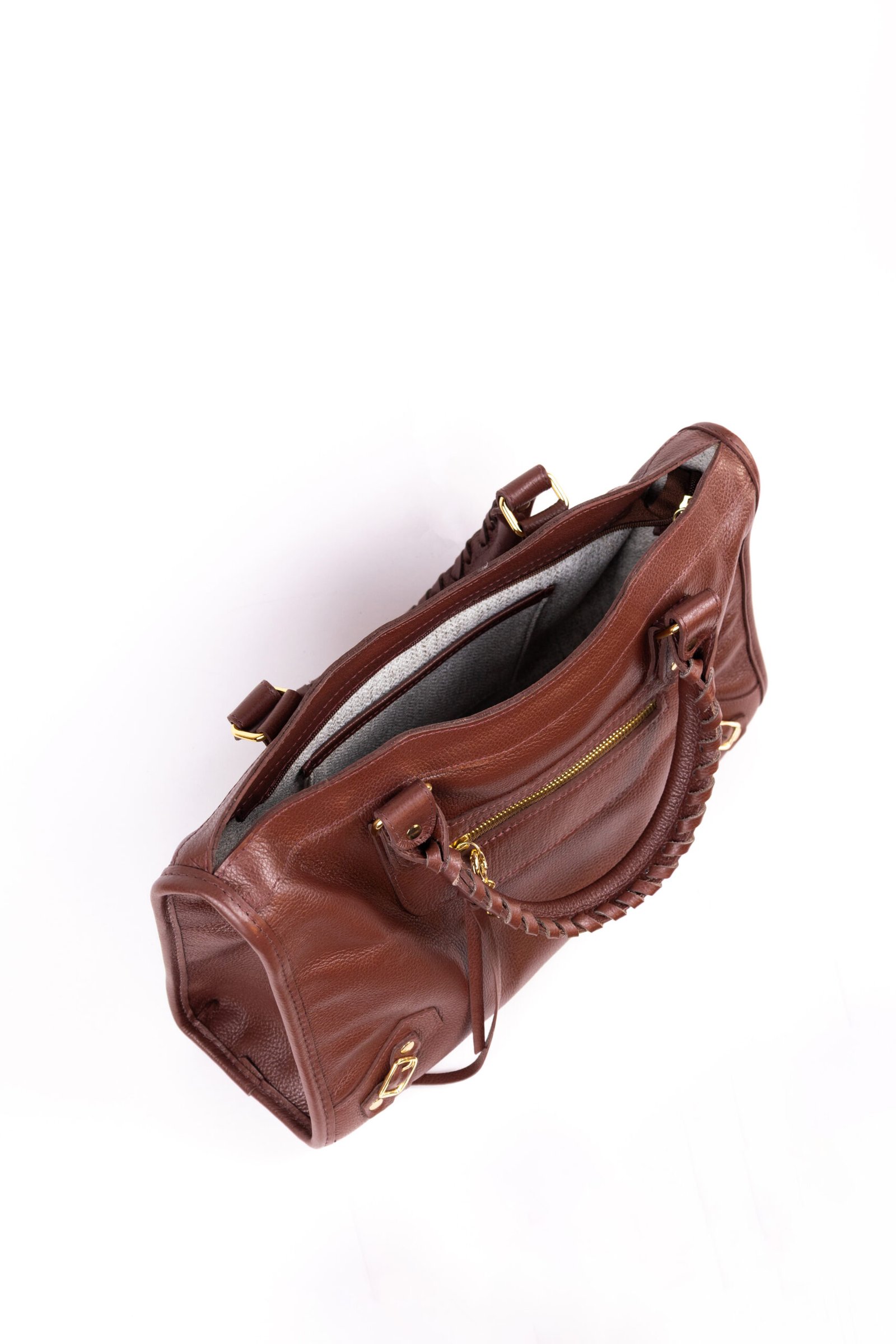 Com detalhes frontais que conferem um ar moderno e inovador, a Fiore destaca-se pela sua alça de mão ricamente trabalhada, que traz uma textura artesanal ao modelo. O grande charme está no contraste: o couro castanho é iluminado por metais com banho dourado, que conferem um brilho luxuoso e atemporal à peça. Tudo isso em uma estrutura surpreendentemente leve, de apenas 400g.